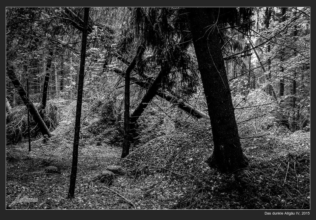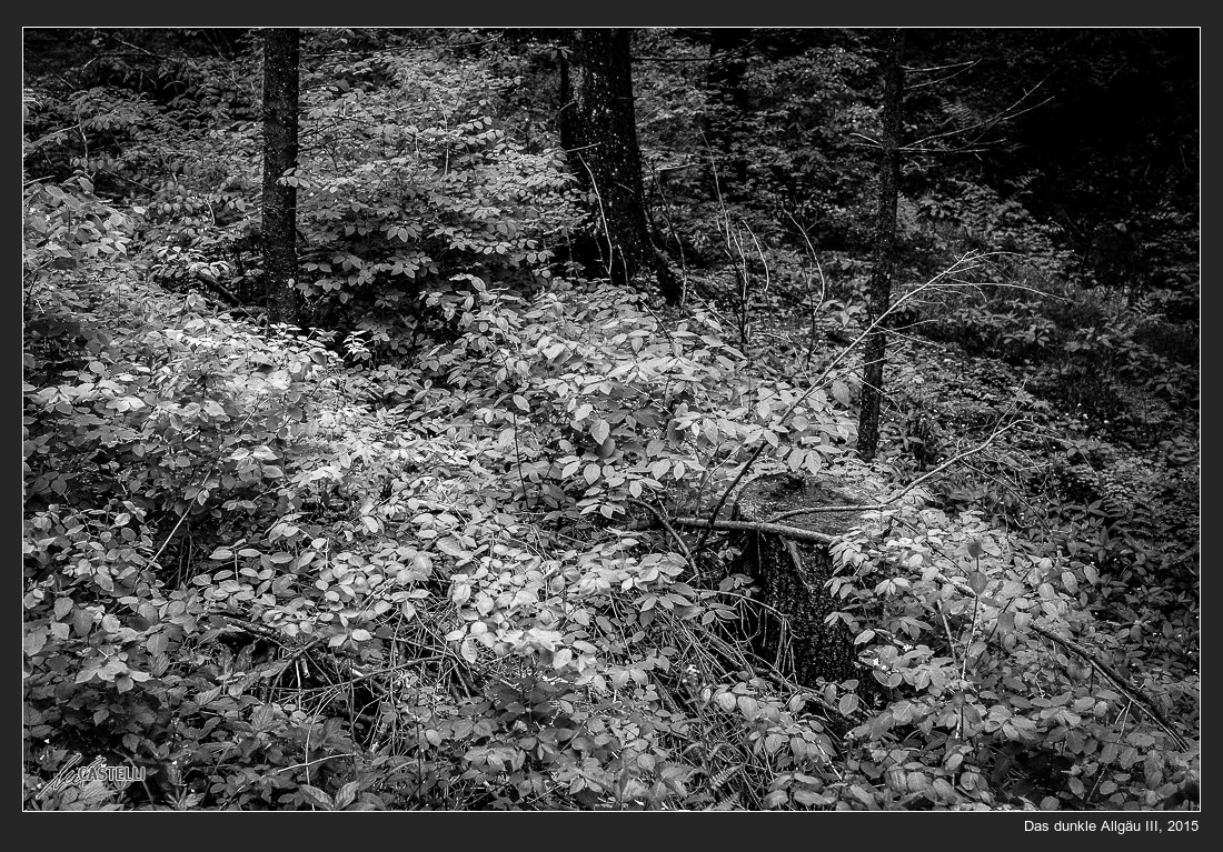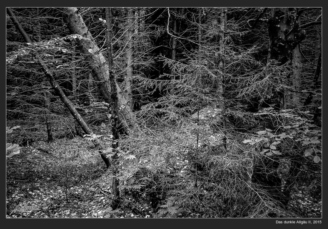 Dunkelbunte Waldlandschaft konsequent in Graustufen umgesetzt, wirkt garnicht farblos und erinnert an Zeiten, als ich mit 6×6-Kamera und Rollfilm oder Kleinbildkamera und der üppigen Möglichkeit, sogar 36 Aufnahmen statt nur 12 latente Bilder auf das Filmstück von 1,80 m Länge belichten zu können. Was packen wir dagegen unterdessen auf unsere Speicherkarten in den Digitalkameras!? Auf meiner 32GB-Karte finden beispielsweise bis zu 450 Fotodateien Platz.