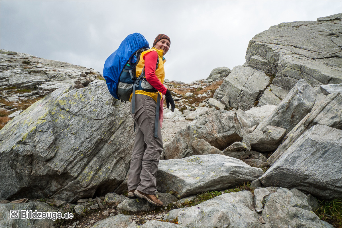Gleich sind wir über die erste Scharte der vor uns liegenden Bergkette, zwei Überquerungen folgen noch. Es fing an zu schneien, was uns lieber war als Regen, da die Felsensteine rutschig geworden wären.
