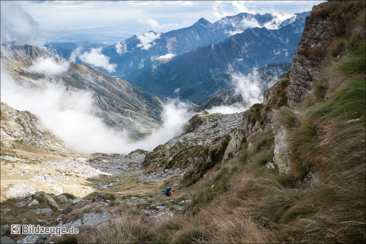 Letzte Bergscharte des Tages und nun geht es 1400 Meter runter, doch nach etwa 100 Metern steht uns das Winterquartier einer geschlossenen Berghütte zur Übernachtung bereit – hoffentlich.